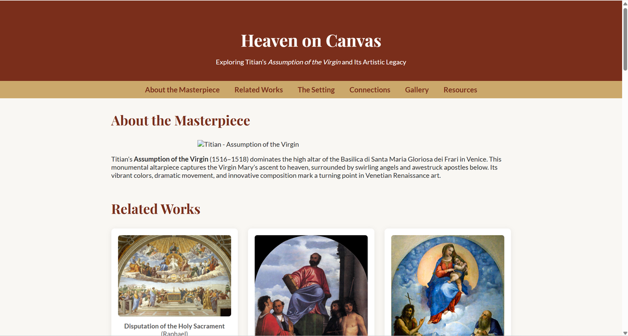 Once again, GPT-4.1 exceeded my expectations. It intuitively recognized Assumption of the Virgin as the central theme and made it the focal point of the website(even though it wasn’t able to display the image correctly). Even more impressive, it chose a red-and-gold Renaissance-inspired color scheme, echoing Titian’s artistic preferences and the sacred atmosphere of altarpieces. When I inquired further, it explained that the palette was inspired by Venetian Renaissance art, with red symbolizing passion and gold representing divinity.